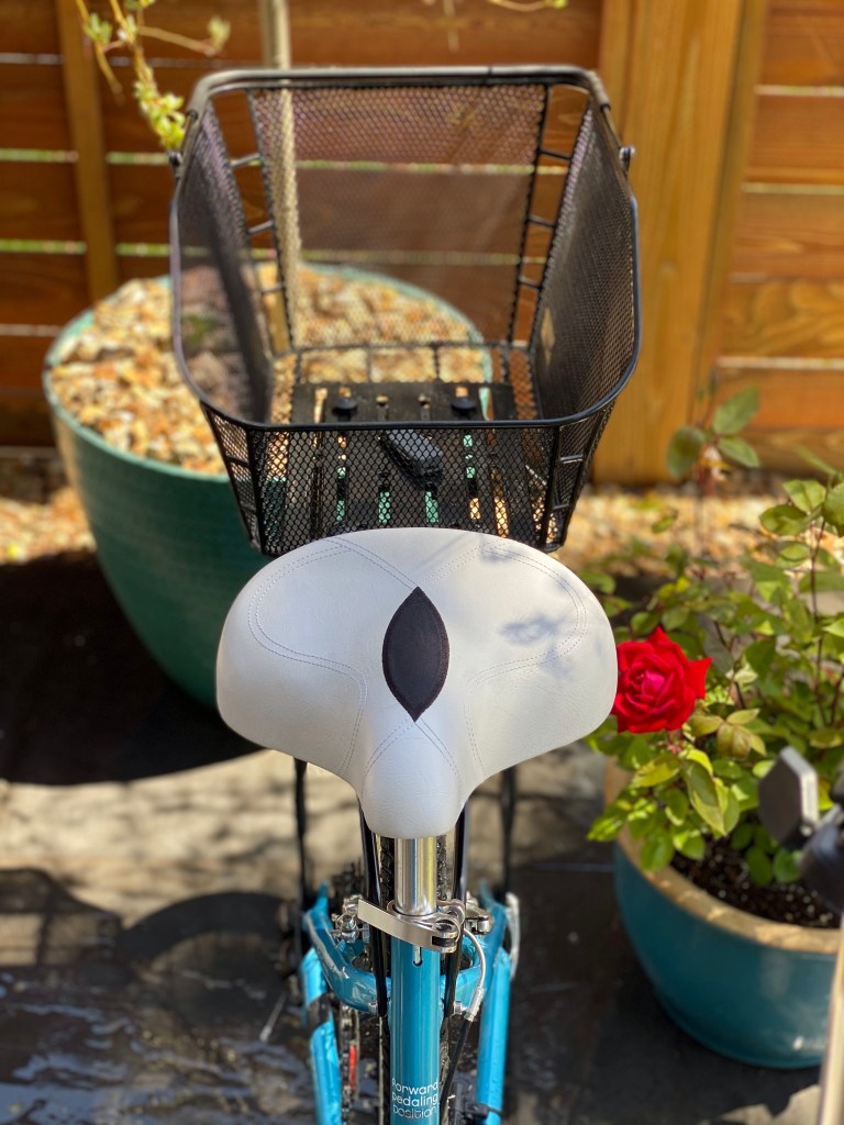 This beauty also includes a stunning white and black leather cruiser seat, forward pedaling position for comfort, V-brakes and 7-speed Shimano shifter, bottle holder, and detachable rear bike basket (with handle).